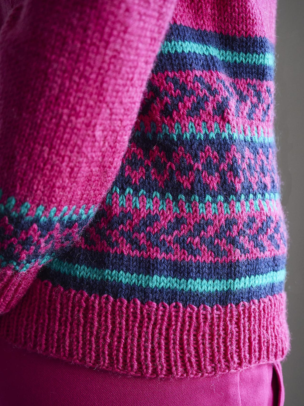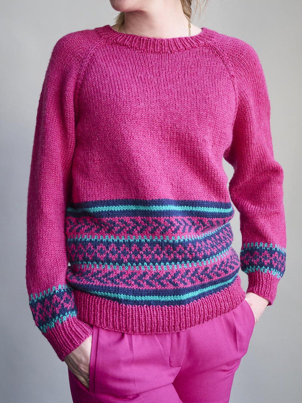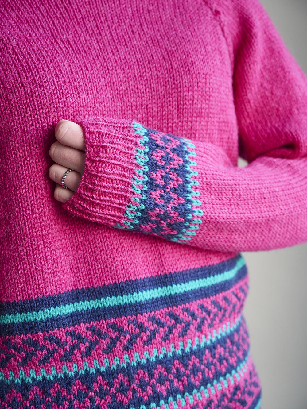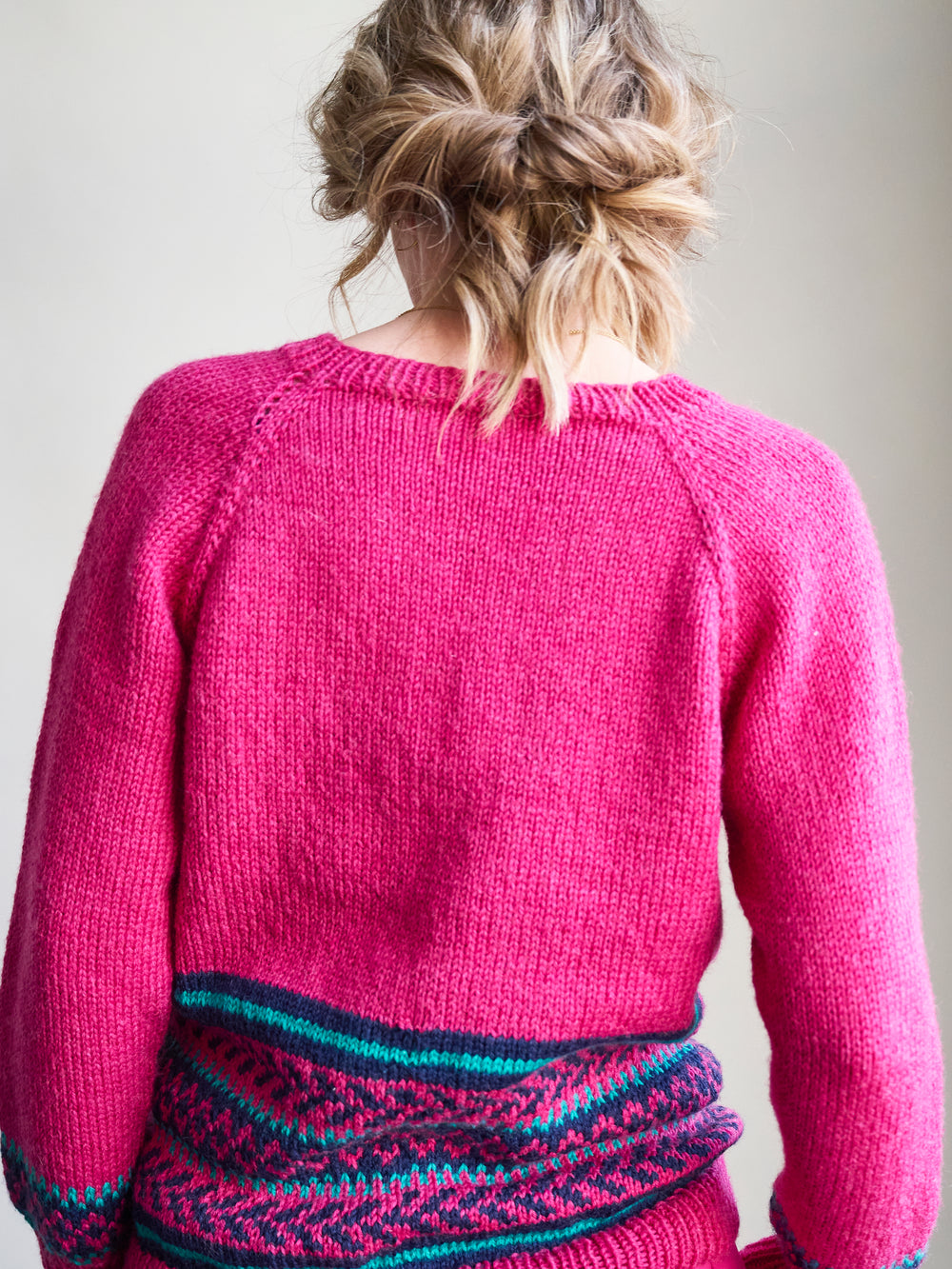 Thyra sweateren strikkes oppefra og ned i retstrik og rib med raglanudtagninger i bærestykket. I begyndelsen af arbejdet strikkes German short rows, der giver sweateren en rigtig god pasform. Sweateren strikkes med mønster i et enkelt diagram, som med sine kontrastfarver er en flot detalje.