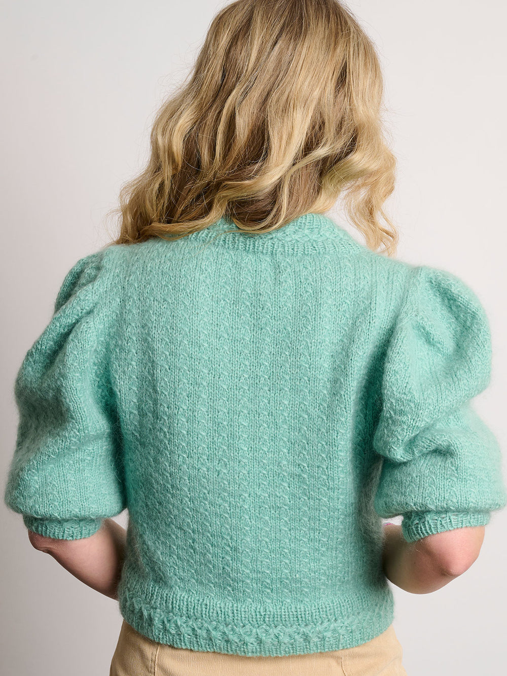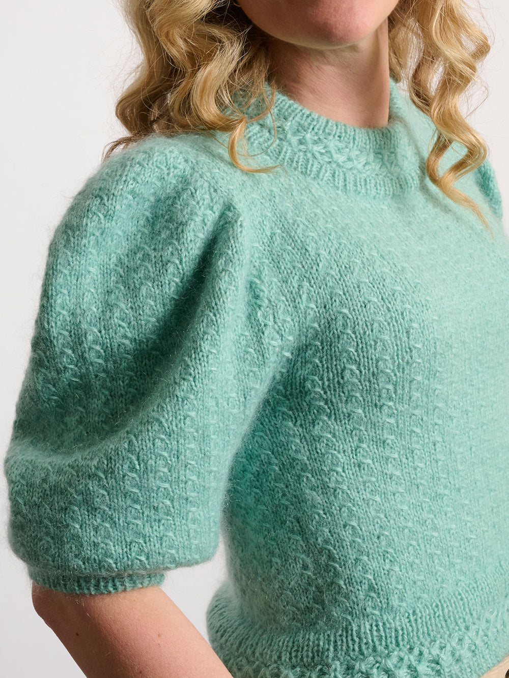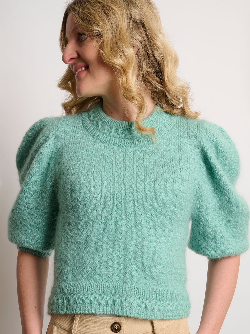 Ulla tee er strikket oppefra og ned, og man bemærker straks det flotte mønster i alle ribkanter. Selve halskraven er designet til at give en ekstra flot pasform omkring halsen. Hele designet bliver samlet af det fortryllende strukturmønster, som dækker blusen, og mønsteret ligner små snoninger og understreger designets feminine og romantiske udtryk.