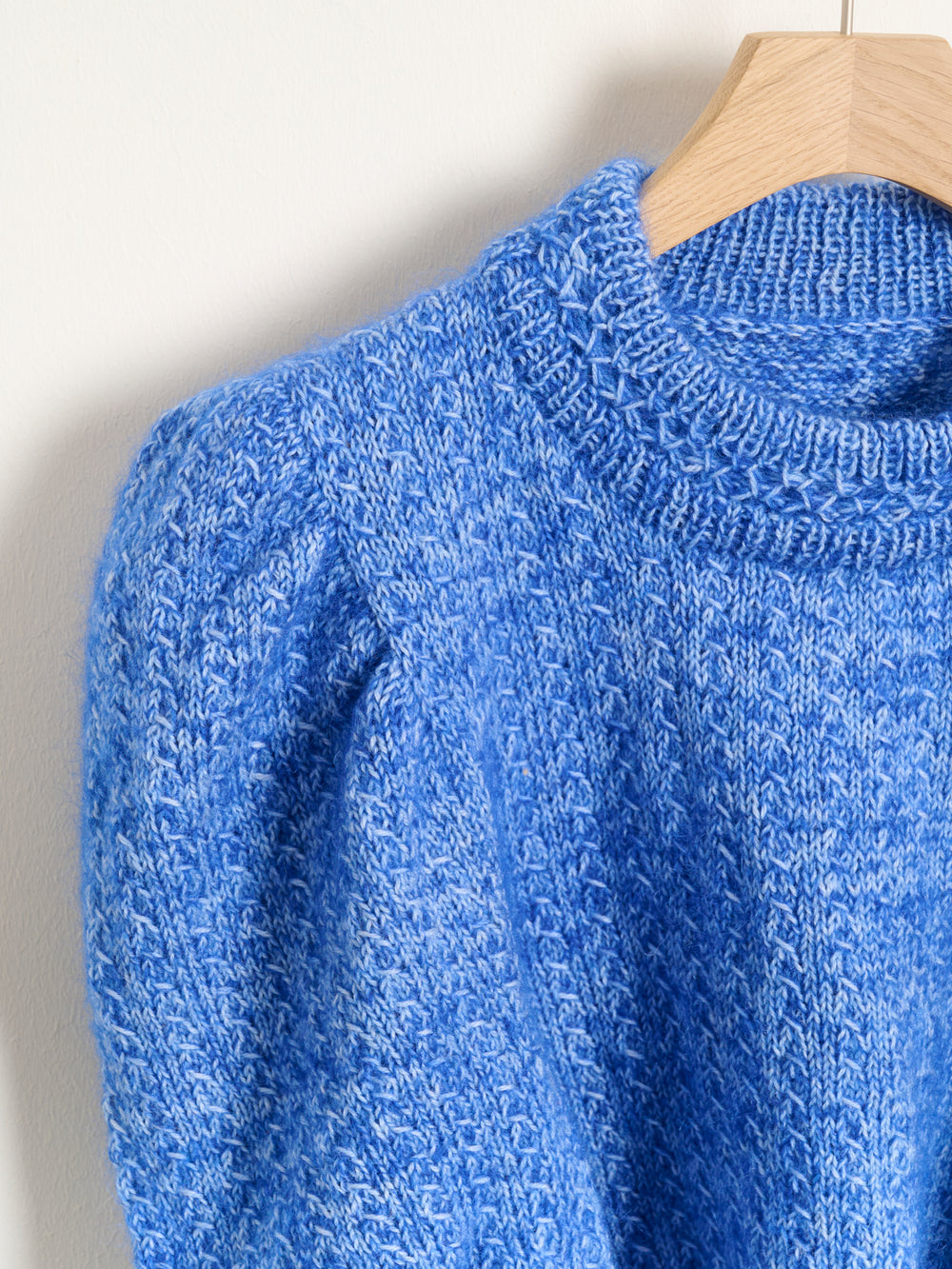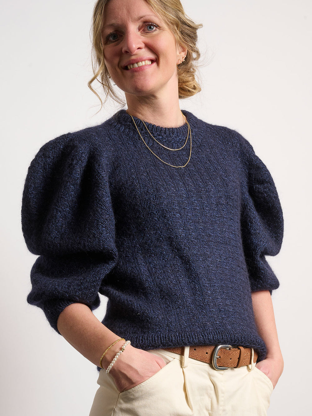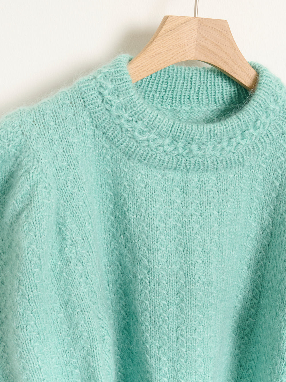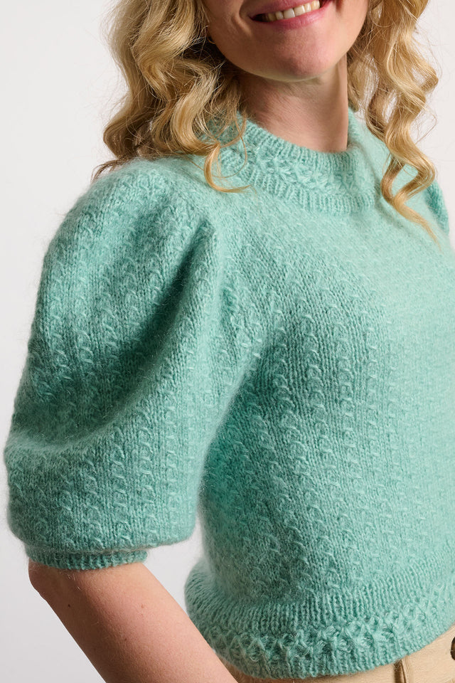 Ulla Tee er strikket i én tråd Mayflower Easy Care og én tråd Mayflower Super Kid Silk. Mayflower Easy Care er en lækker garnkvalitet i ren uld, mens Super Kid Silk består af mohair og silke. To meget forskellige garnkvaliteter, men tilsammen fremhæver de virkelig hinandens absolut bedste egenskaber og giver blusen den rette struktur kombineret med et smukt skær af mohair.