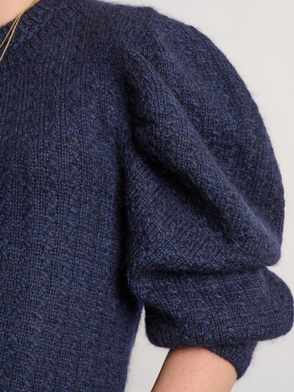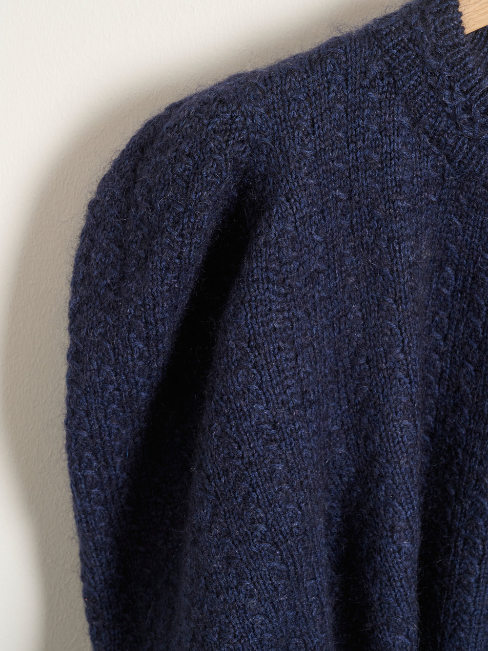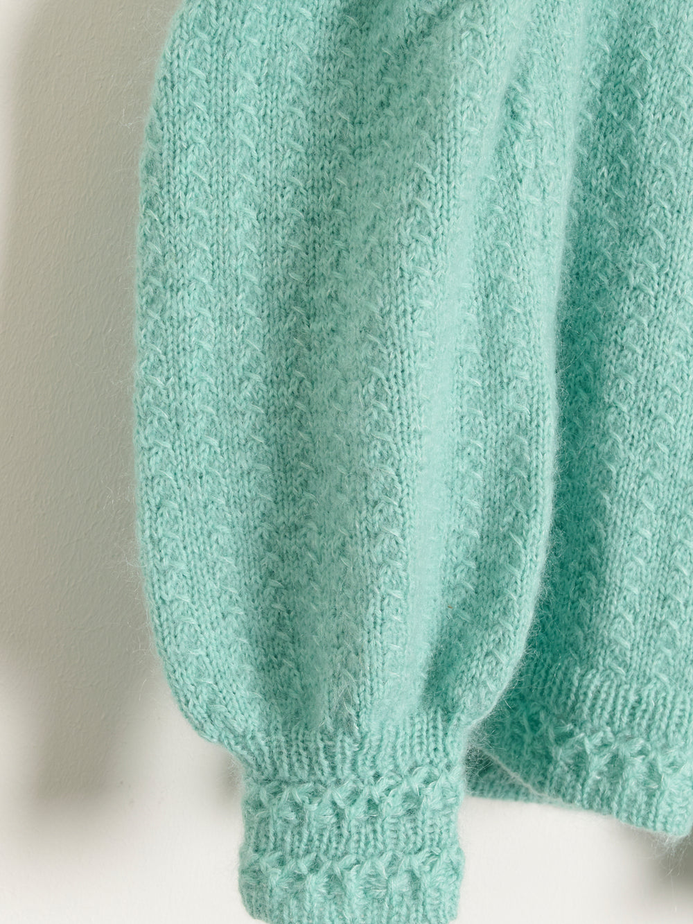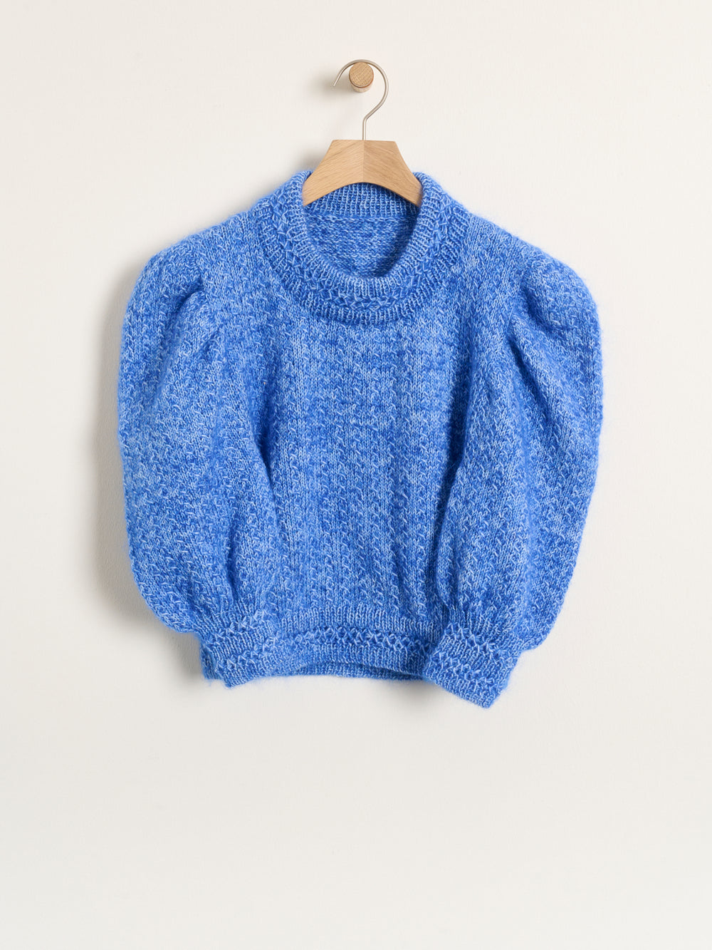 Ulla Tee er strikket i én tråd Mayflower Easy Care og én tråd Mayflower Super Kid Silk. Mayflower Easy Care er en lækker garnkvalitet i ren uld, mens Super Kid Silk består af mohair og silke. To meget forskellige garnkvaliteter, men tilsammen fremhæver de virkelig hinandens absolut bedste egenskaber og giver blusen den rette struktur kombineret med et smukt skær af mohair.