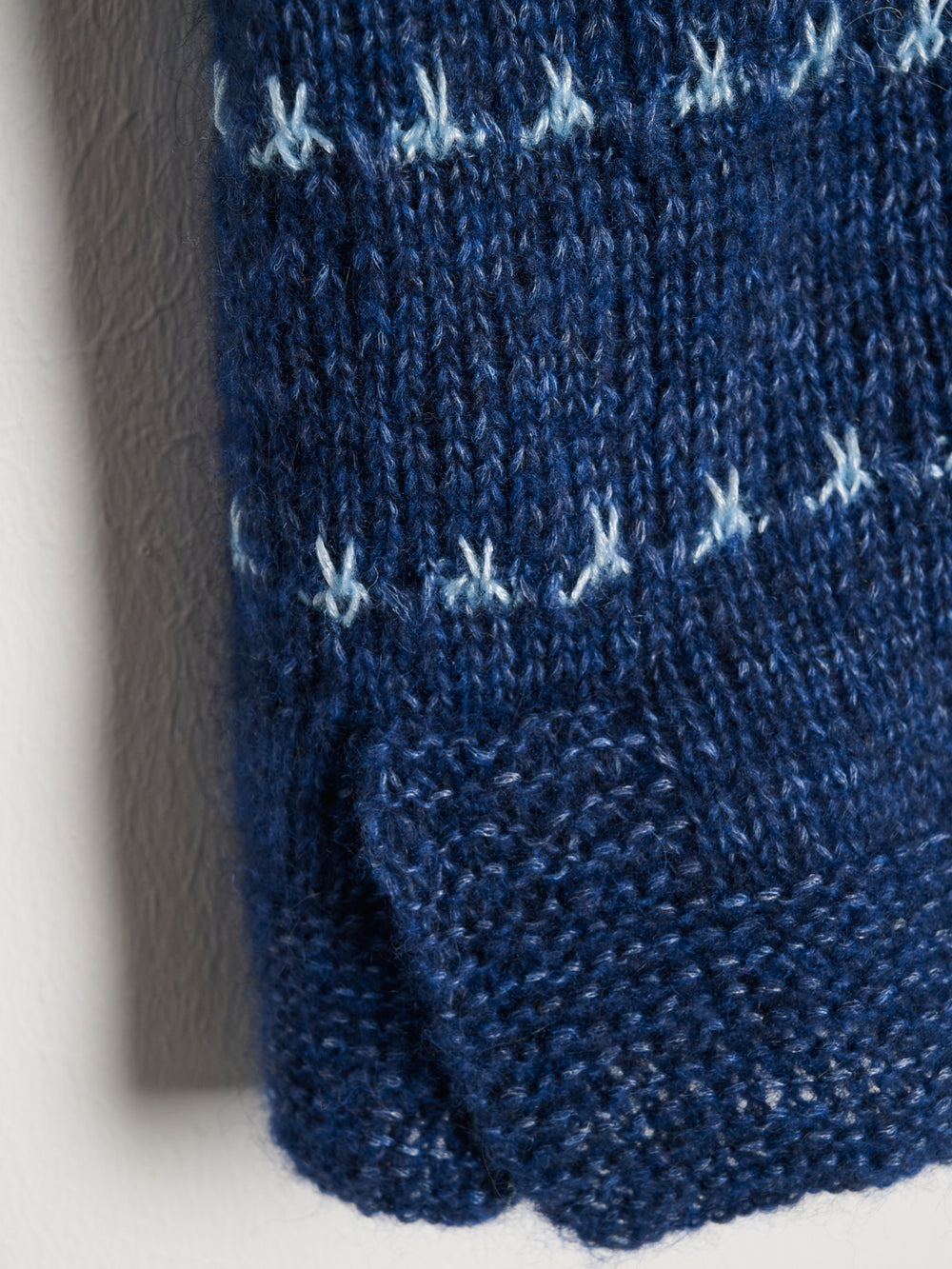 Strikkefasthed: 22 m og 35 p i glat med Santiago Light på p 4 mm = 10 x 10 cm