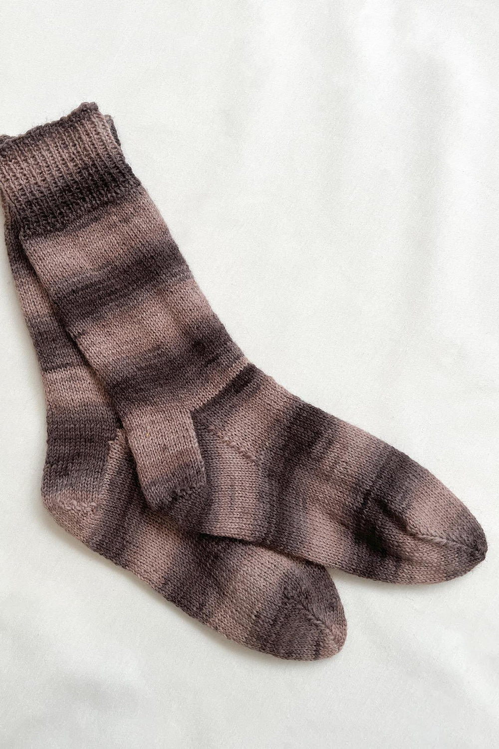 Helt klassiske og enkle men ikke desto mindre skønne strømper, som har kilehæl. Strømperne strikkes i glatstrik med en ribkant foroven. Med glatstrik kan du hurtigt strikke skaft og sål, og opskriften hjælper dig godt igennem både hæl og tå. Slutresultatet er et par skønne og behagelige strømper, som har et flot, stribet mønster.