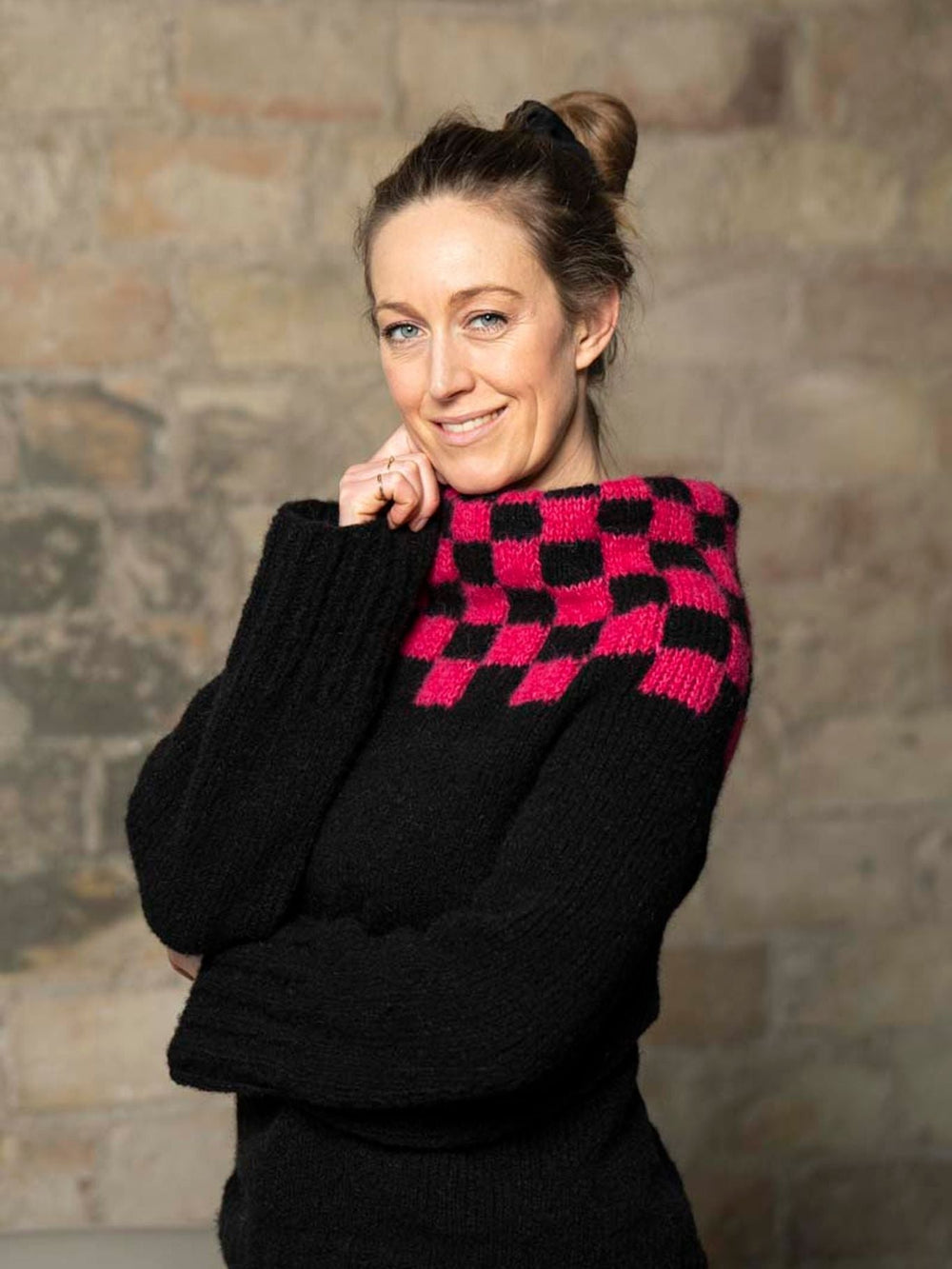 Sweateren strikkes oppefra og ned. Du starter derfor med den ternede krave, hvorefter kroppen strikkes færdig, mens ærmemaskerne hviler. Til sidst strikkes ærmerne.