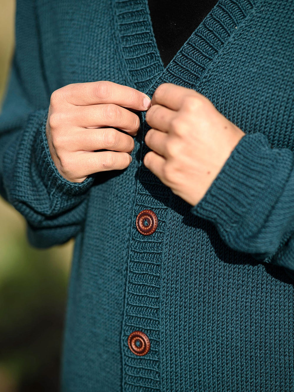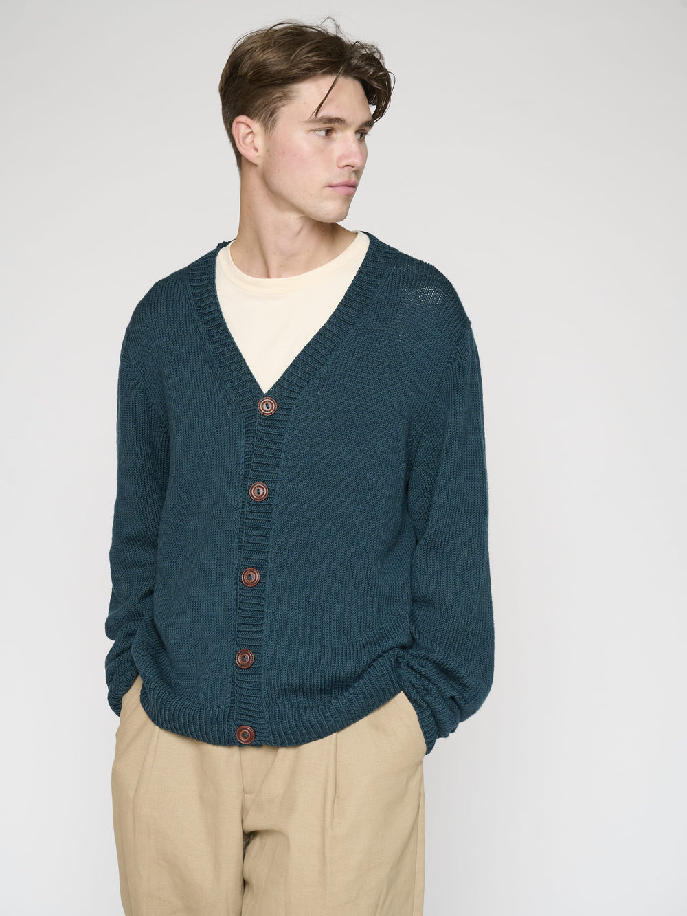 Bag- og forstykker strikkes for sig og samles under ærmegabet, hvor cardiganen strikkes færdig. Der slås masker op til ærmer i ærmegabene. Efterfølgende slås der masker op til forkanter, hvor der strikkes fem knaphuller i den ene side. Cardiganen har derfor nærmest ingen montering.