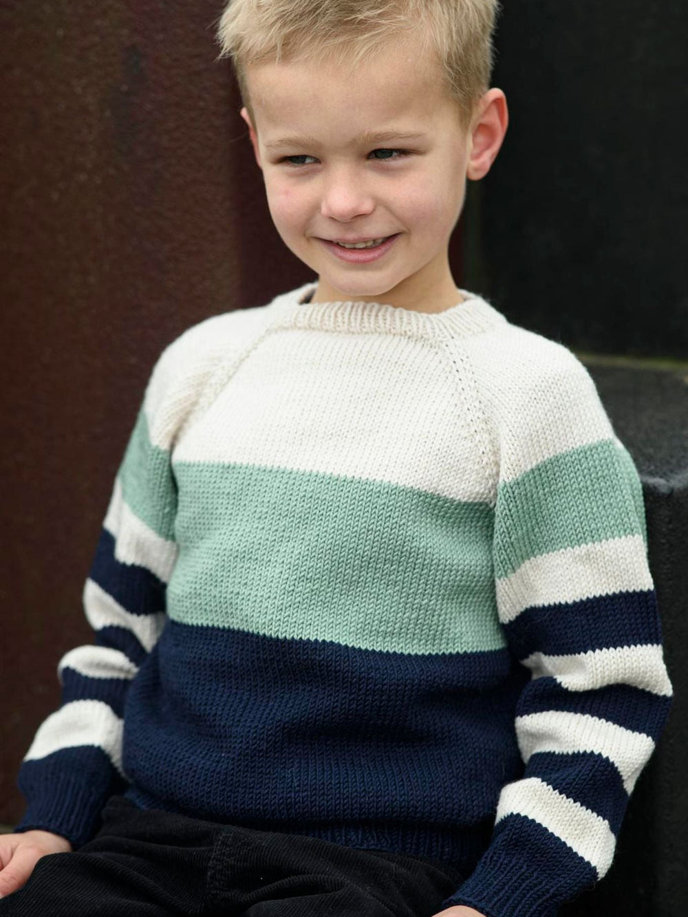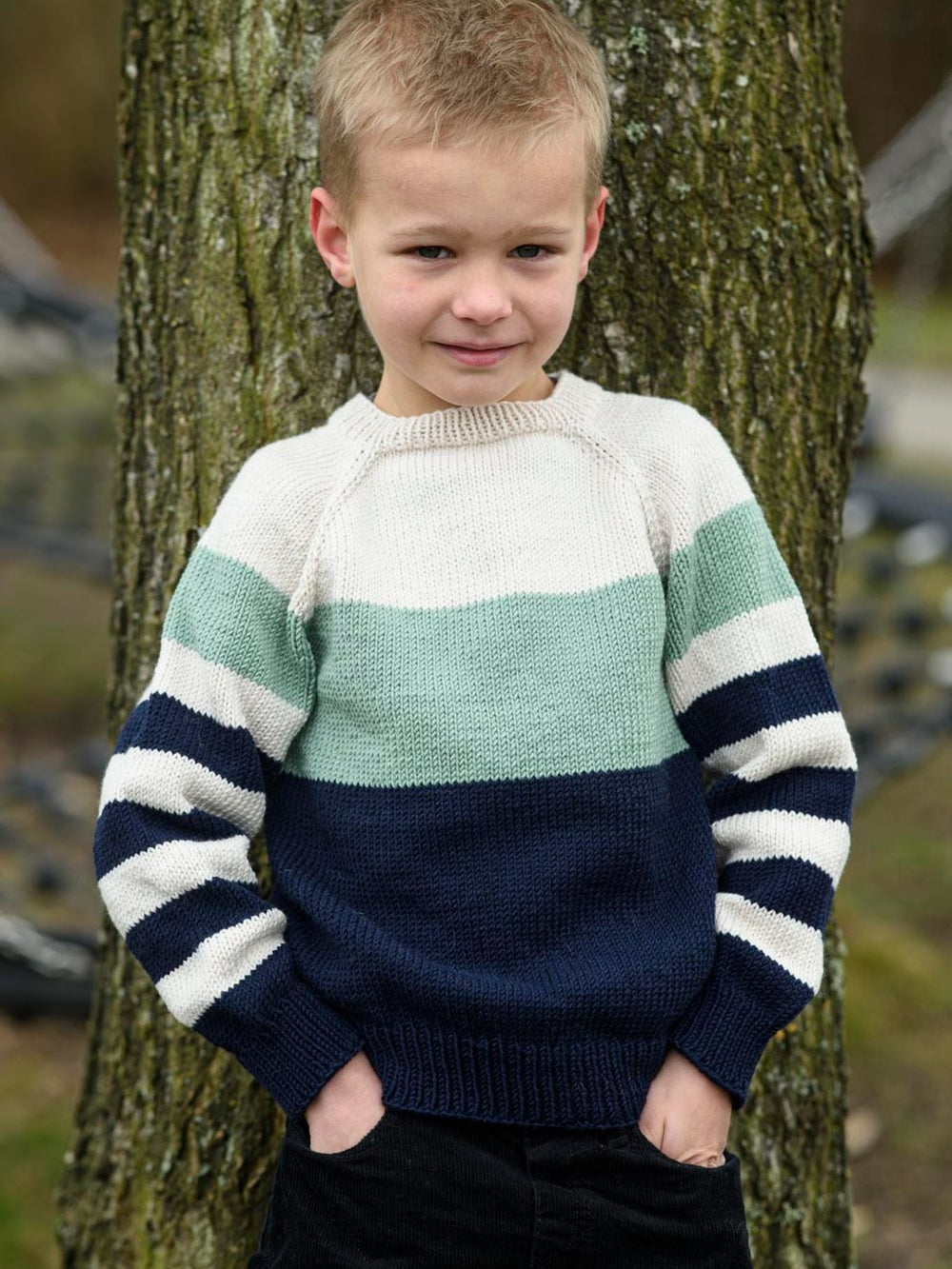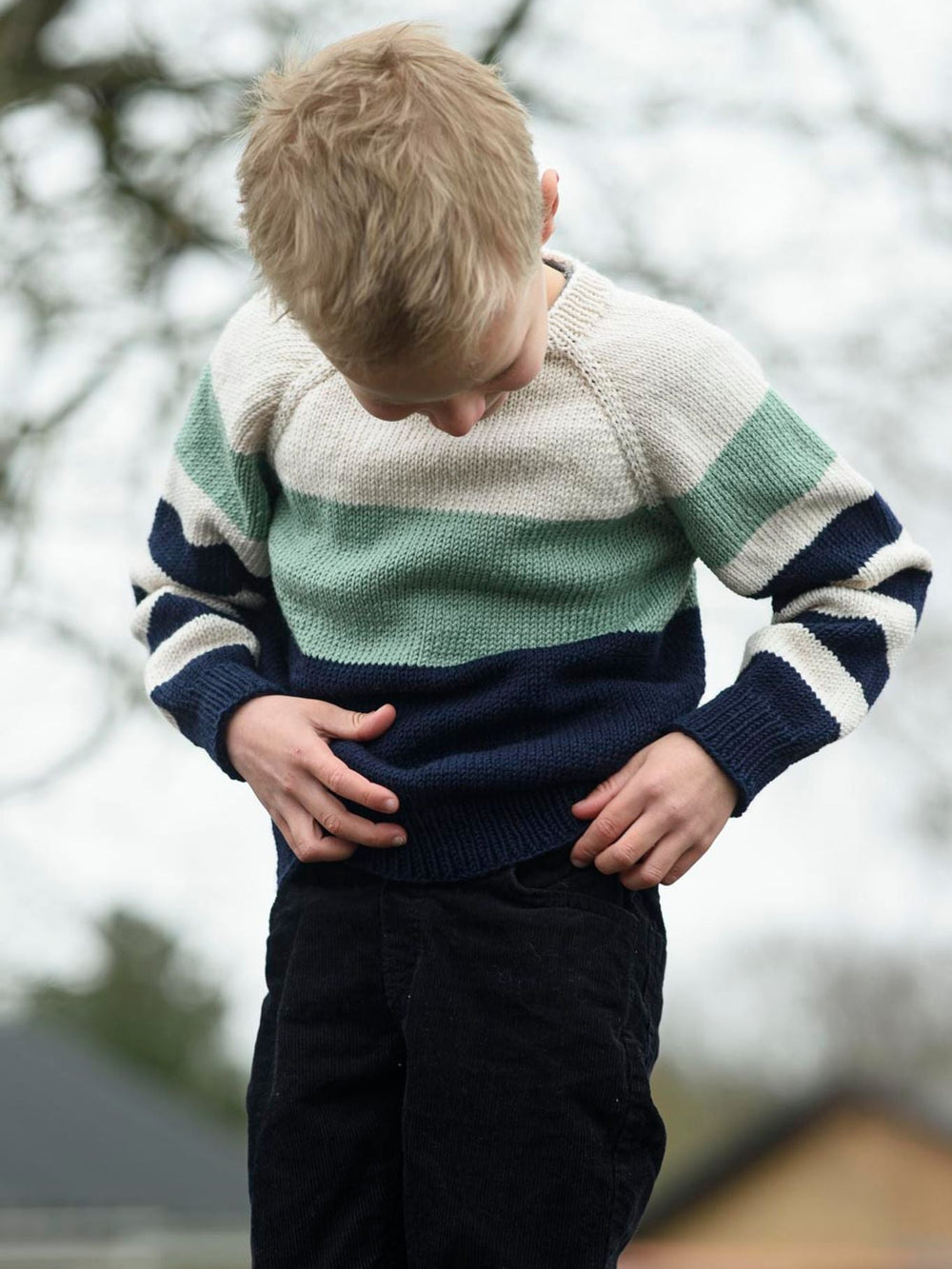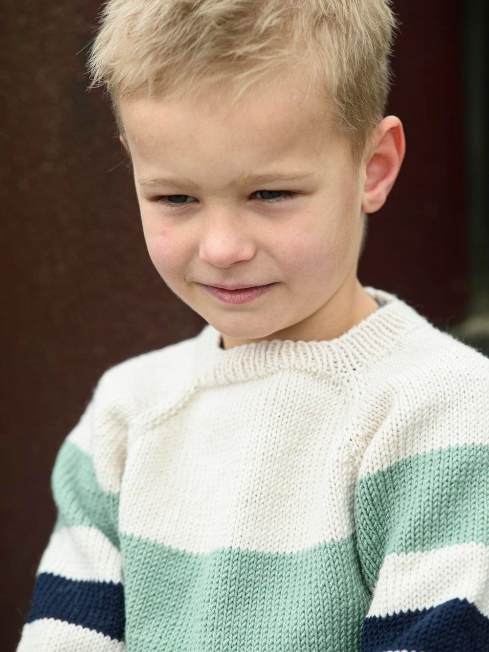 Lækker sweater til børn i alderen 2-12 år, som strikkes topdown i et stribet mønster.