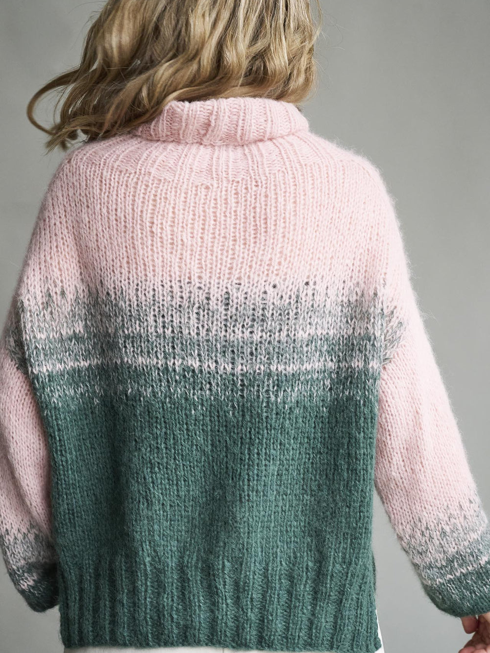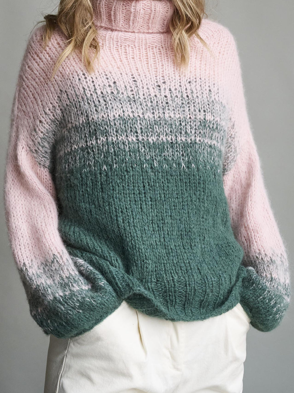 Vejgaard sweateren har en helt fantastisk og fyldig struktur, da den strikkes med hele 4 tråde. Med brugen af flere tråde opstår muligheden for at lave et smukt farveskiftemønster, hvis du løbende udskifter farven på én tråd ad gangen, hvilket giver en smuk graduering.