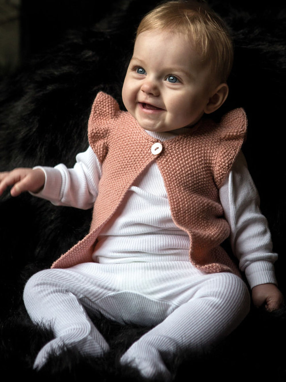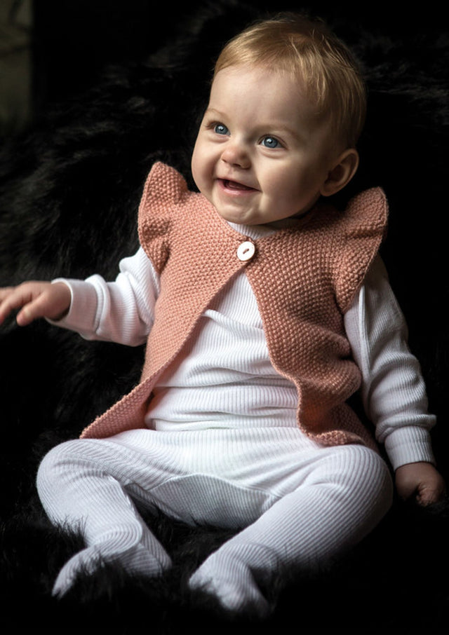 Vesten strikkes i Mayflower Easy Care, som er den tyndeste og fineste kvalitet i Easy Care-serien. Den er spundet på 100% uld og føles behagelig mod huden. Easy Care er den foretrukne uld til den travle børnefamilie, da det kan vaskes i vaskemaskine og tørres i tørretumbler.