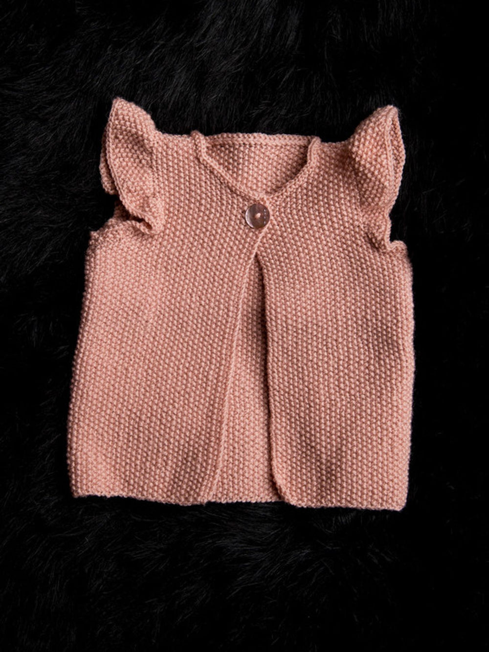 Bedårende vest med flæser på skuldrene og en enkelt knap ved halsen.