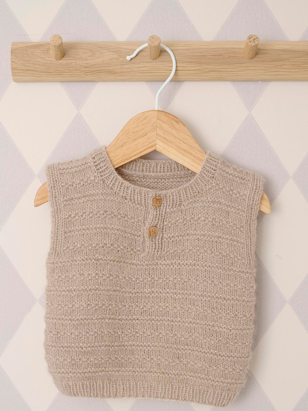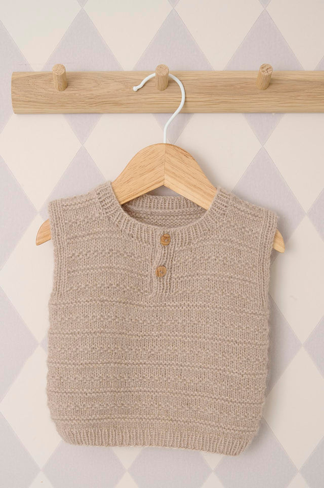 Den fineste, lille vest, som passer til børn i alderen 0-2 år. Vesten strikkes nedefra og op. Først med en ribkant og derefter i et fint strukturmønster. Vesten monteres med 2 små knapper i front.