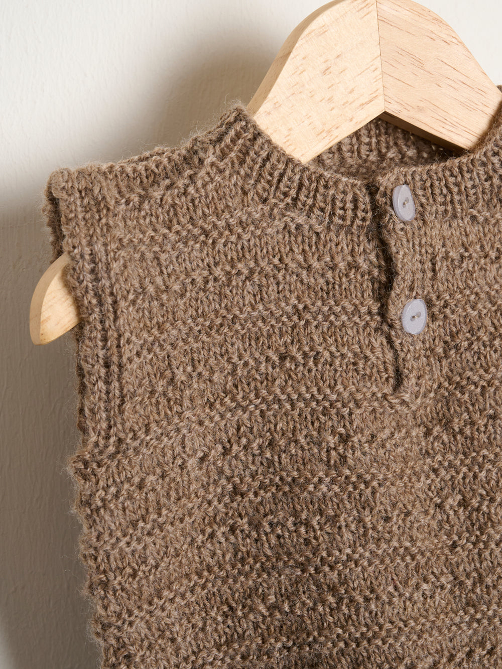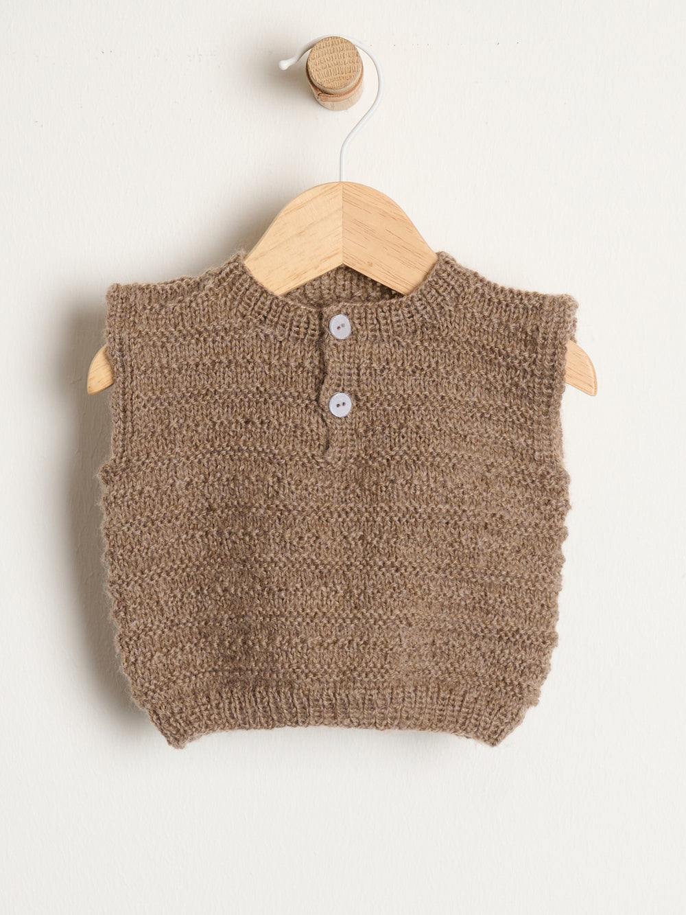 En fin, lille vest til børn i alderen 0-2 år. Vesten strikkes nedefra og op. Først med en ribkant og derefter i et fint strukturmønster. Vesten monteres med 2 små knapper i front.
