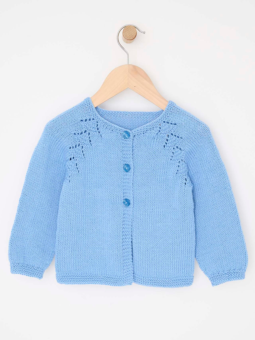 Vibeke cardigan har et enkelt design med et dekorativt og feminint hulmønster i raglanudtagningerne i bærestykket. Cardiganen strikkes oppefra og ned og afsluttes med knapper i den øverste del af bærestykket. Designet er sødt til både bukser, shorts og en kjole.