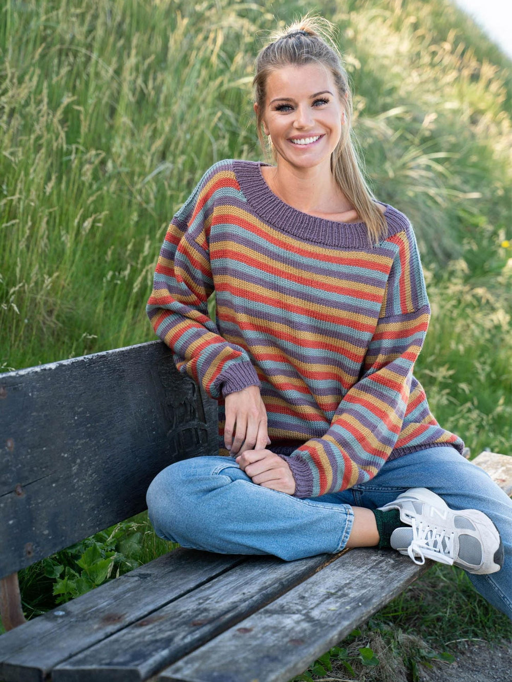Vi har valgt at designe denne sweater med striber i fire farver. Hver for sig er farverne flotte, og tilsammen giver de en skøn kombination af stemningsfulde efterårsfarver.