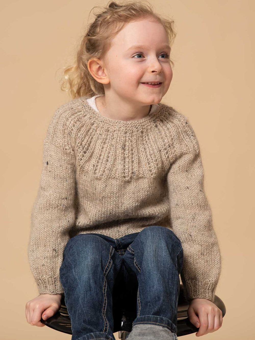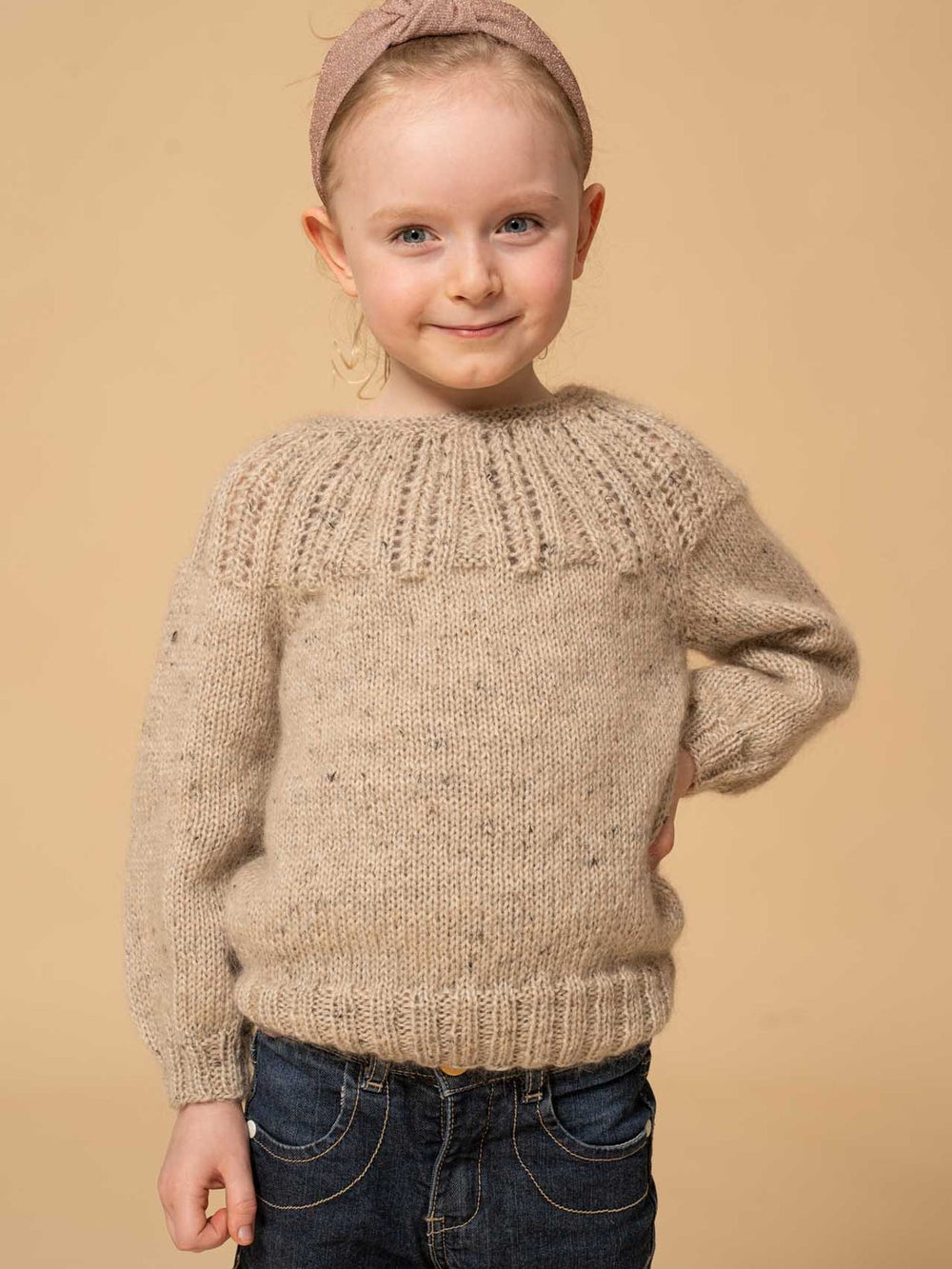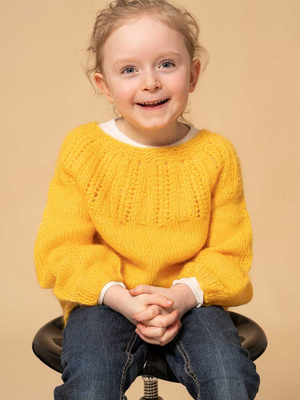 Viola sweater junior er en miniudgave af den populære Viola sweater, så nu kan der strikkes matchende sweatere til både mor og datter. Sweateren er karakteristisk med sit smukke hulmønster, som dækker bærestykket. Alligevel beholder den et enkelt look, da resten af sweateren er glatstrikket og til sidst afsluttet med en klassisk dobbeltrib.