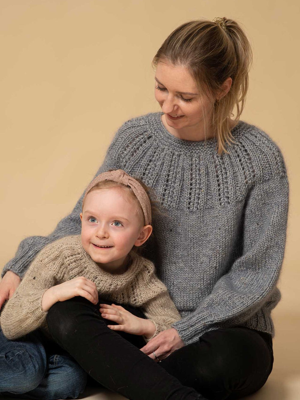 Viola sweater findes også til voksne i to forskellige kvaliteter: Strik den i enten Easy Care Classic Tweed og Super Kid Silk (find opskriften her) eller den i Easy Care Classic og New Sky Light (find opskriften her).