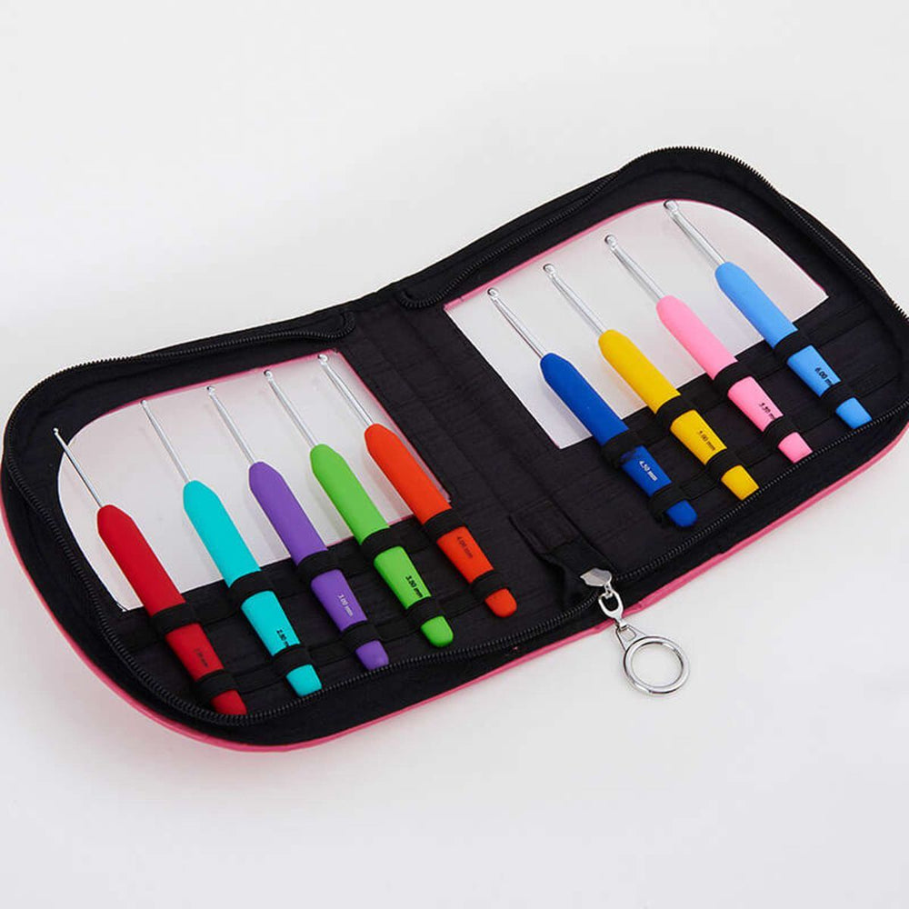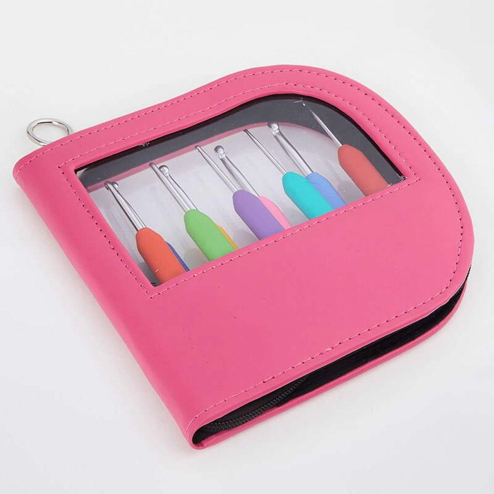 Det praktiske hæklenålesæt leveres i et fint, lille etui, som er holdt i en pink farve. Etuiet fylder ikke meget og kan nemt tages med på tur.