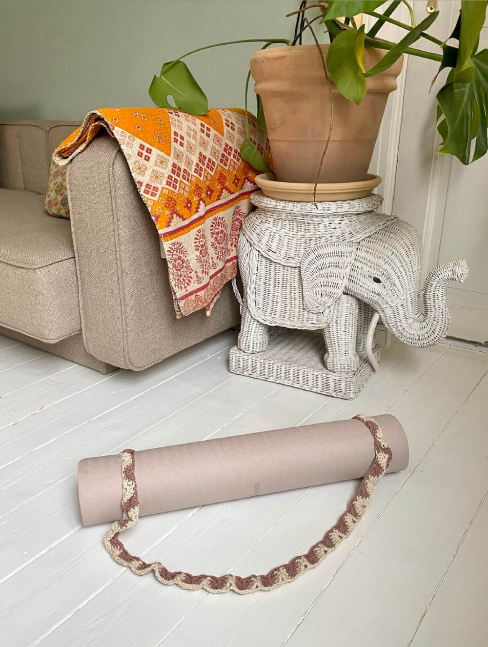 Rose har dyrket yoga i mange år, men har aldrig haft en fin bærerem til sin yogamåtte. Hun designede derfor denne praktiske rem, der passer til alle yogamåtter. Remmen hækles i Mayflower Cotton 8/8, og med bare to nøgler har du hurtigt den fineste bærerem på yogaholdet.